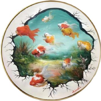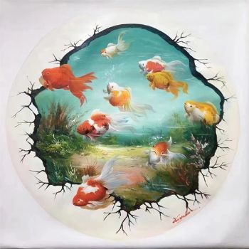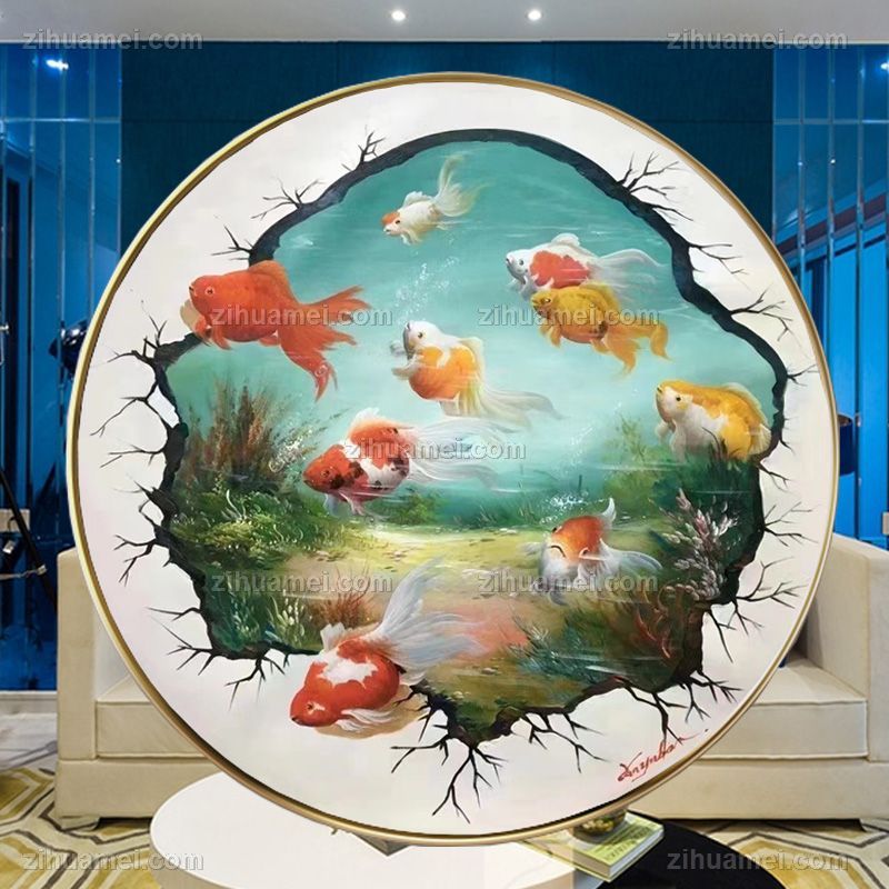 • 原创现代新中式九鱼图纯手绘油画锦鲤图圆形油画