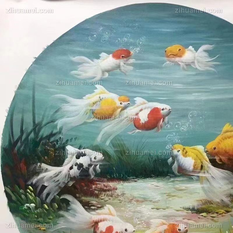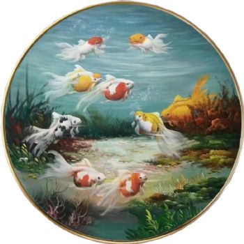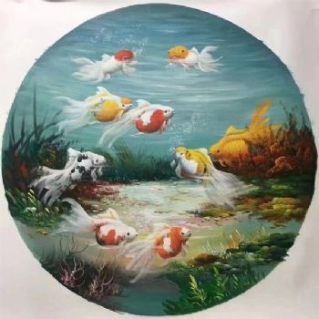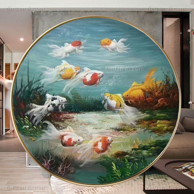 • 动物油画客厅油画小写意新中式九鱼图纯手绘油画锦鲤图圆形油画