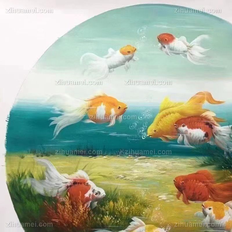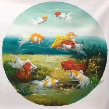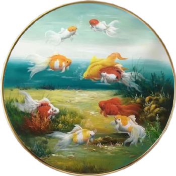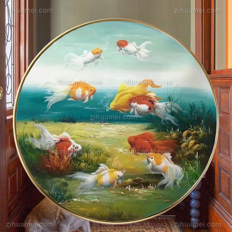 • 圆形油画动物油画酒店装饰油画小写意新中式九鱼图装饰油画