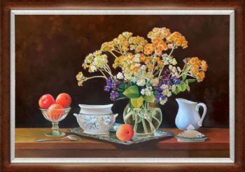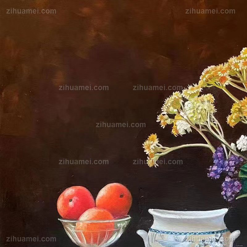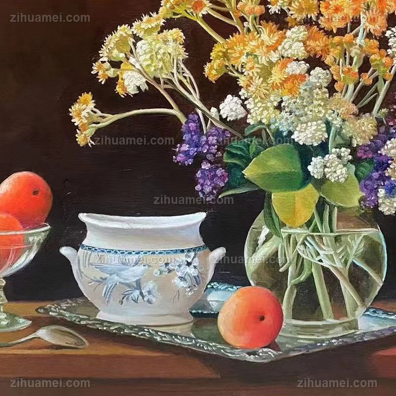 • 精品纯手绘花卉静物写实油画小花与桔子写实油画
