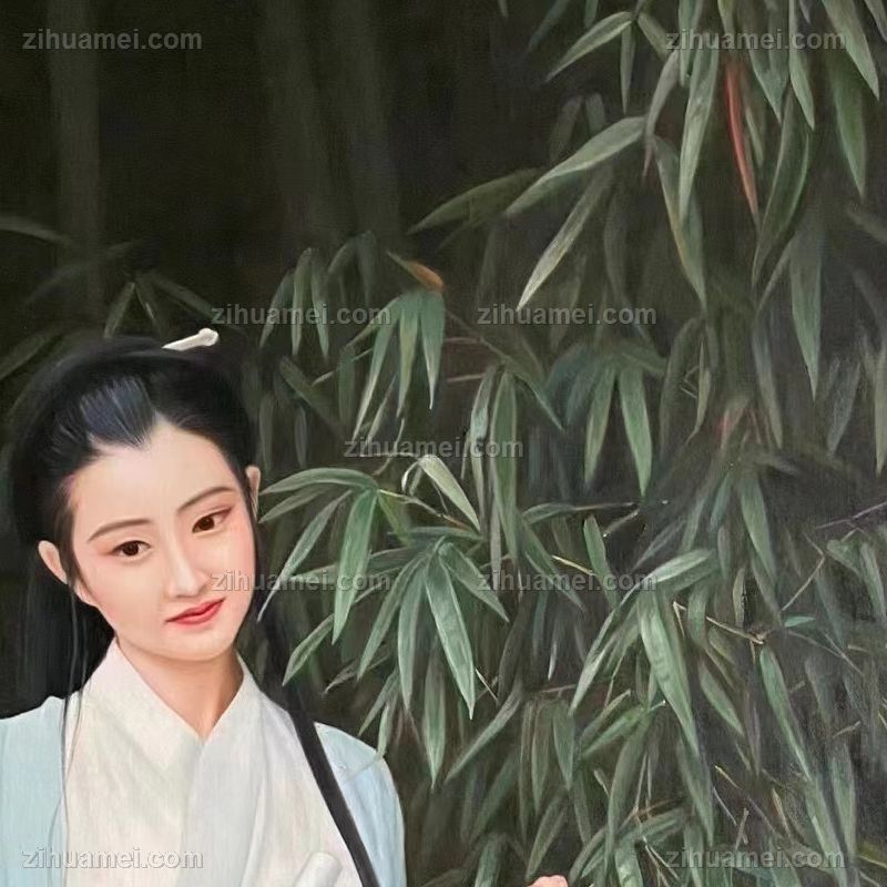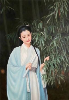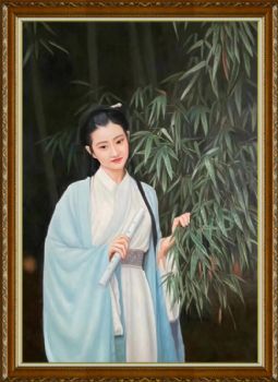 • 纯手绘人物油画新中式古装人物美女图竹林旁思索者实木画框