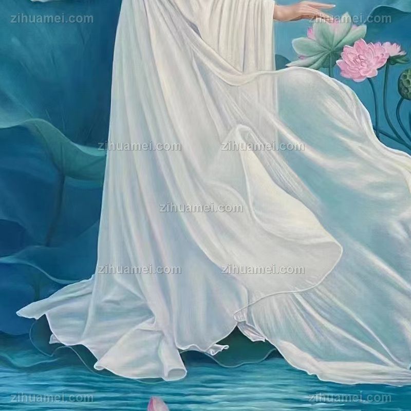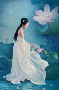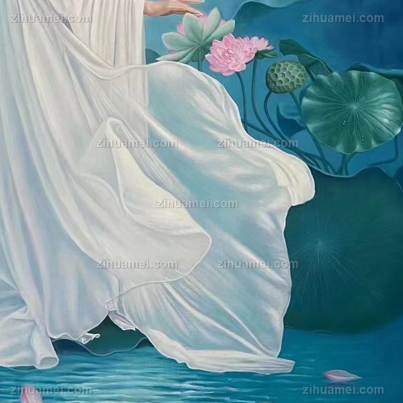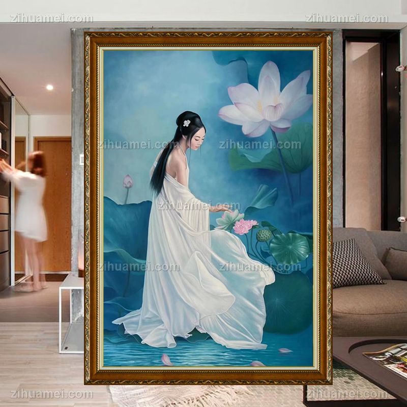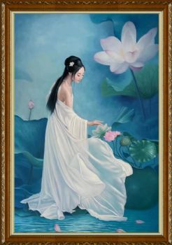• 荷花池美女图实木画框纯手绘人物油画新中式古装人物美女图