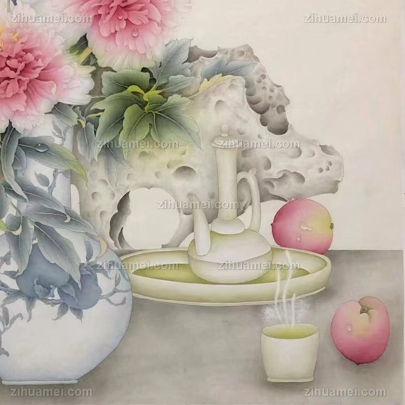 • 牡丹花瓶图红红火火桃子写实中式国画纯手绘工笔水墨国画