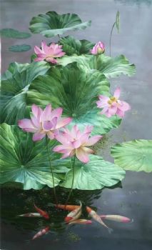 荷花锦鲤风景油画荷花池风景油画纯手绘油画 手绘