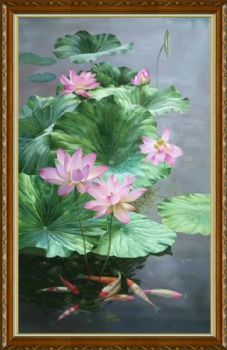 • 纯手绘写实荷花池锦鲤图新中式玄关油画实木画框