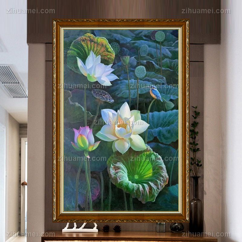 • 新中式纯手绘荷花池风景油画寓意和和美美和气生财实木画框