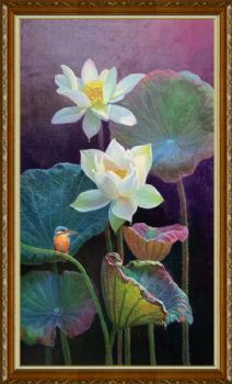 • 新中式风景油画作品纯手绘荷花池写实油画一团和气实木画框