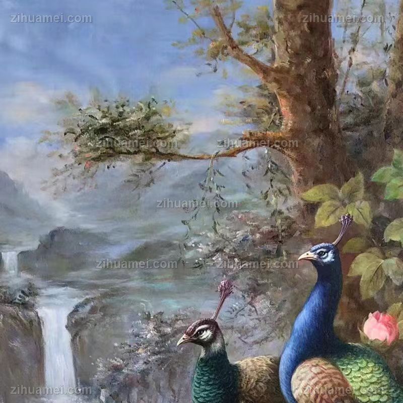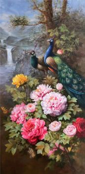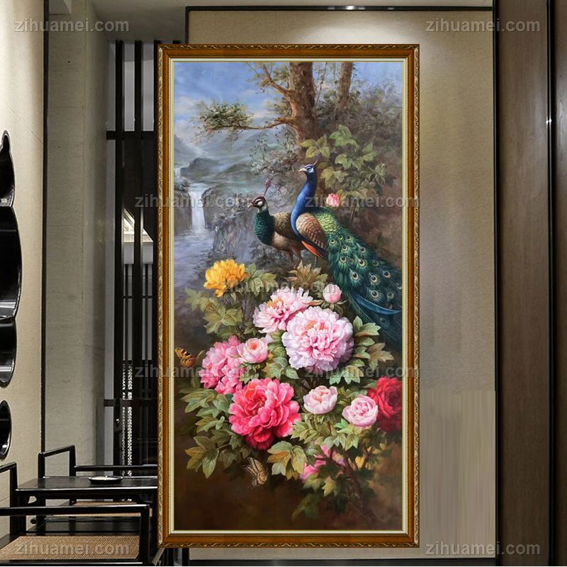 新中式玄关适合的花鸟油画作品牡丹孔雀图