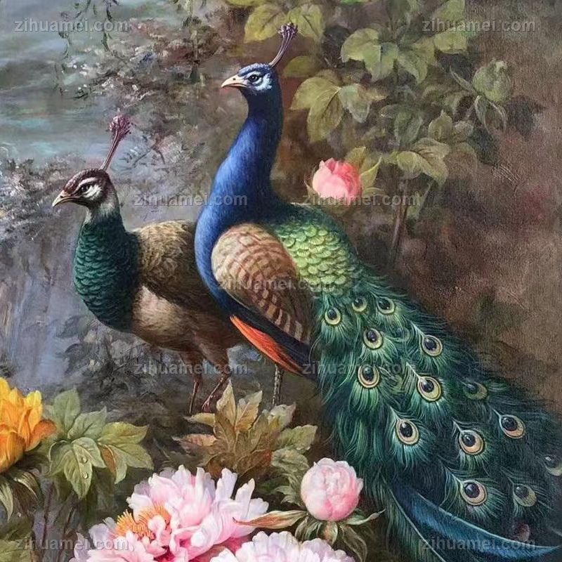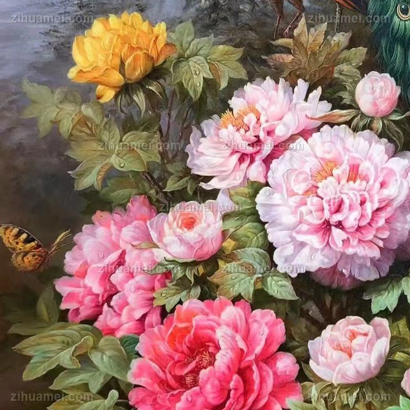 • 纯手绘静物写实花卉油画新中式孔雀牡丹油画花开富贵吉祥孔雀图