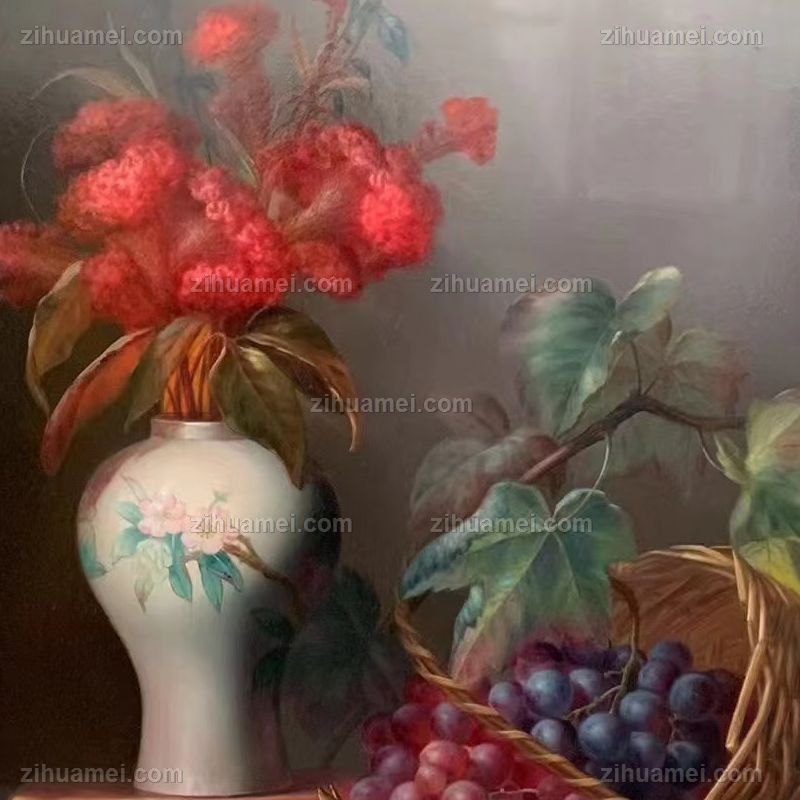• 鸡冠花纯手绘静物写实花卉油画多子多福葡萄石榴新中式油画