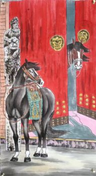 一匹黑马朝鲜国画水墨动物国画骏马图实木画框 手绘