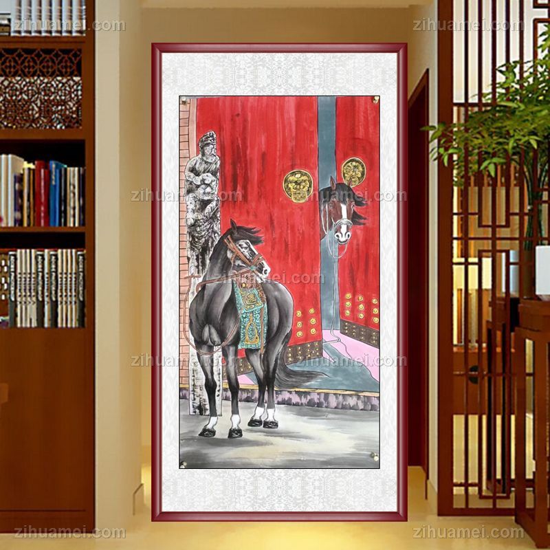 工笔动物写实水墨国画马到成功玄关走廊挂画 手绘