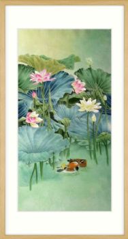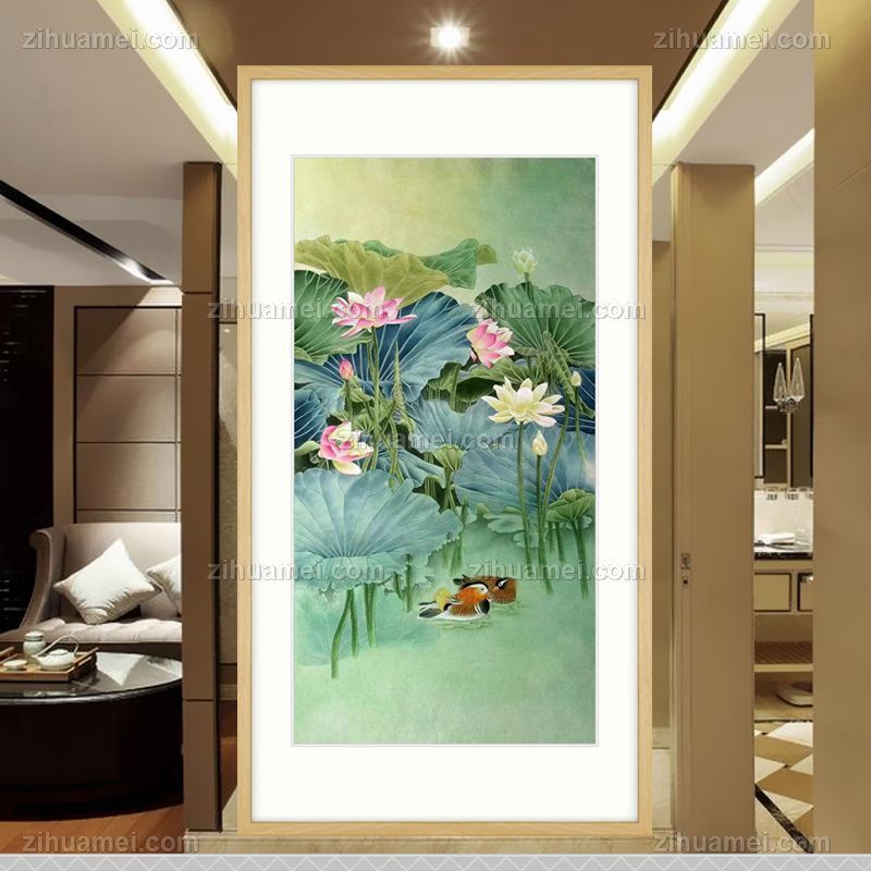 • 精品四尺工笔国画荷花池鸳鸯图纯手绘国画实木画框
