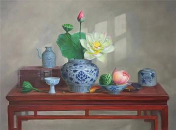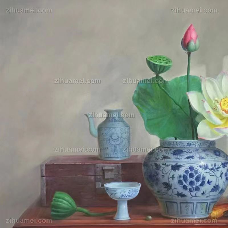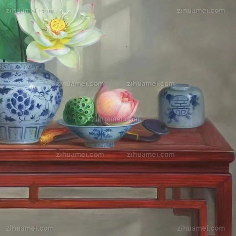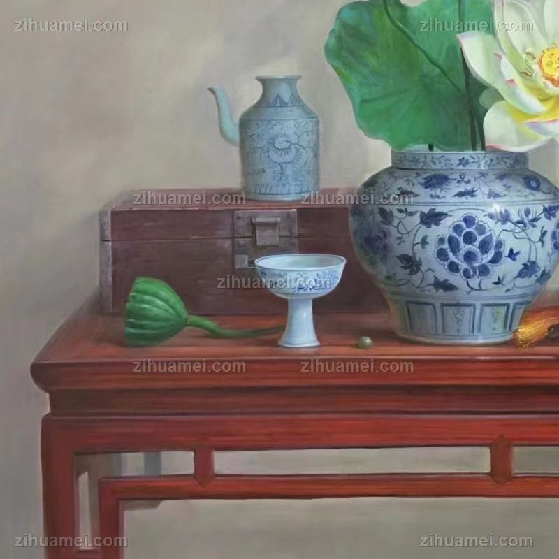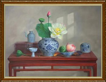 • 新中式纯手绘静物写实油画青花瓷荷花图寓意富贵吉祥平安实木画框