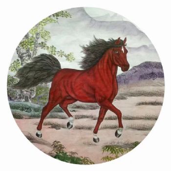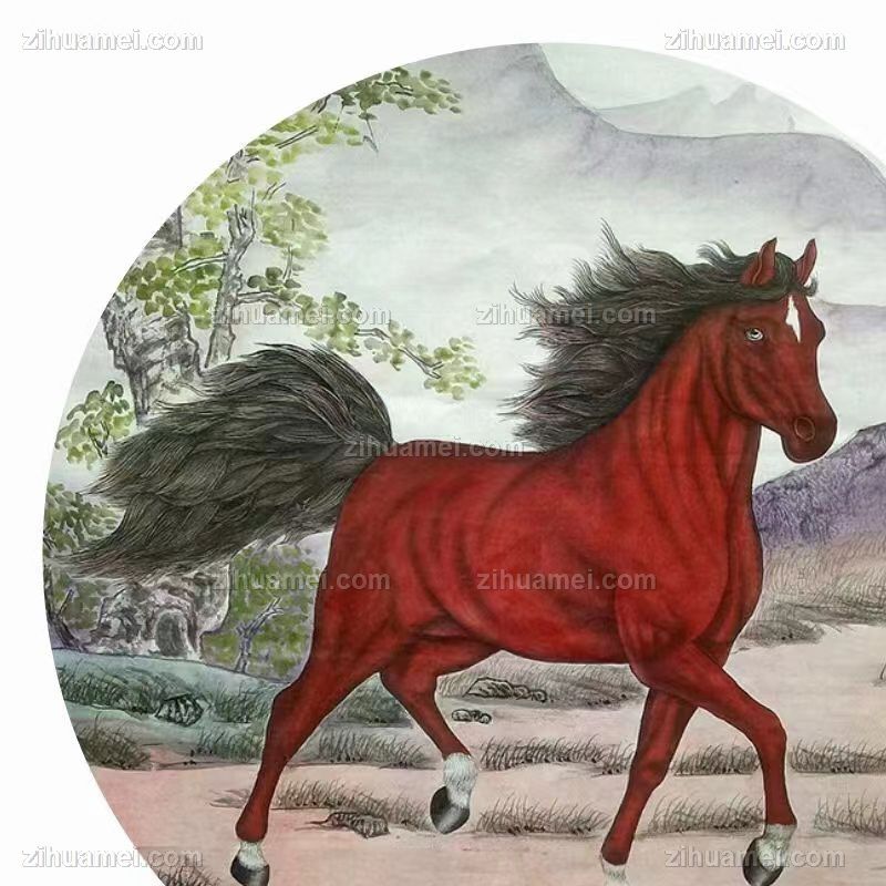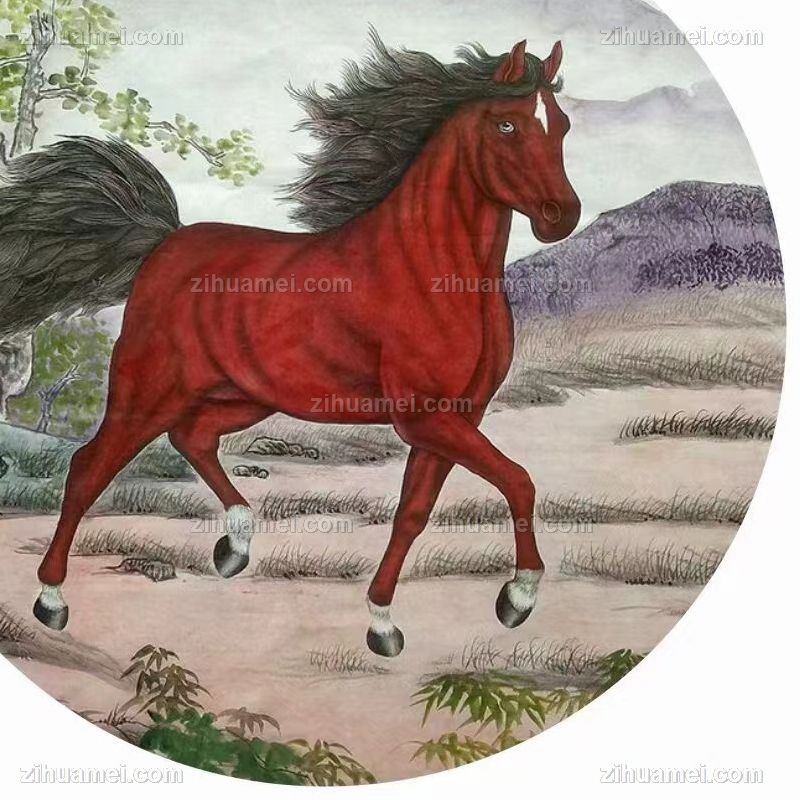 • 马到成功纯手绘国画工笔四尺斗方花鸟扇面奔马图努力办公室挂画柚木画框