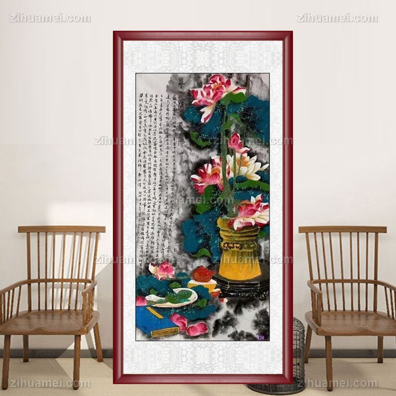适合新中式装修风格玄关的水墨花鸟国画荷花图