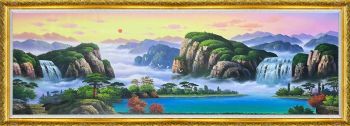 • 旭日东升背靠大山新中式聚宝盆风景油画纯手绘山水画实木画框