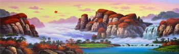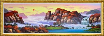 • 秋水共长天一色鸿运当头山水风景油画旭日东升聚宝盆中式油画