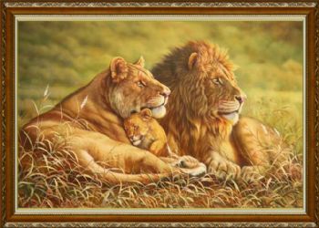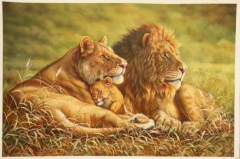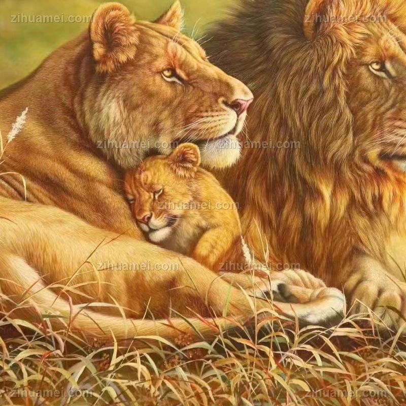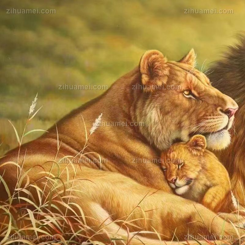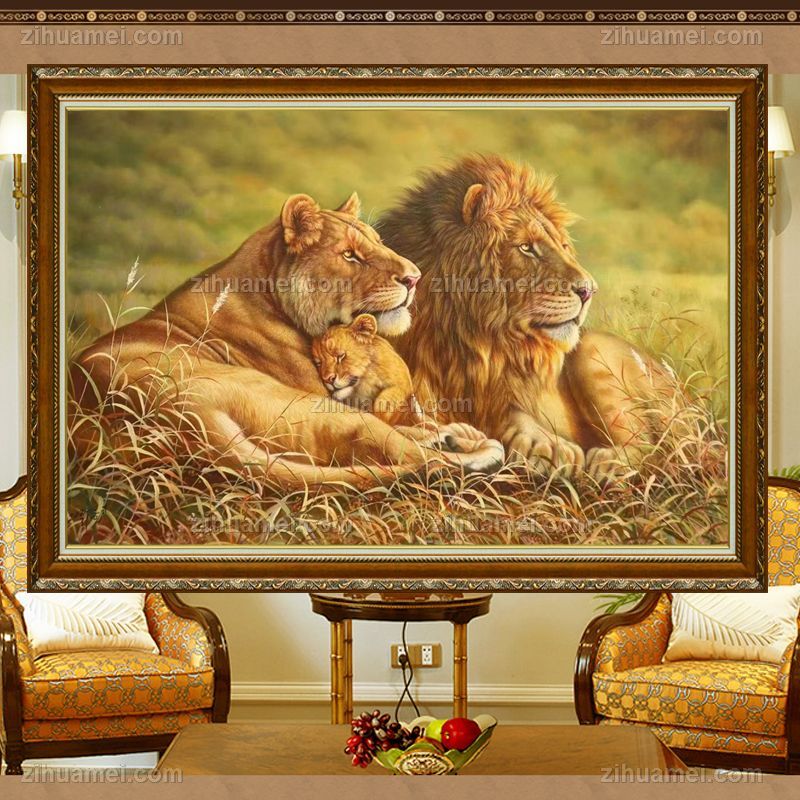 • 收藏精品超写实纯手绘动物油画狮子一家亲实木画框