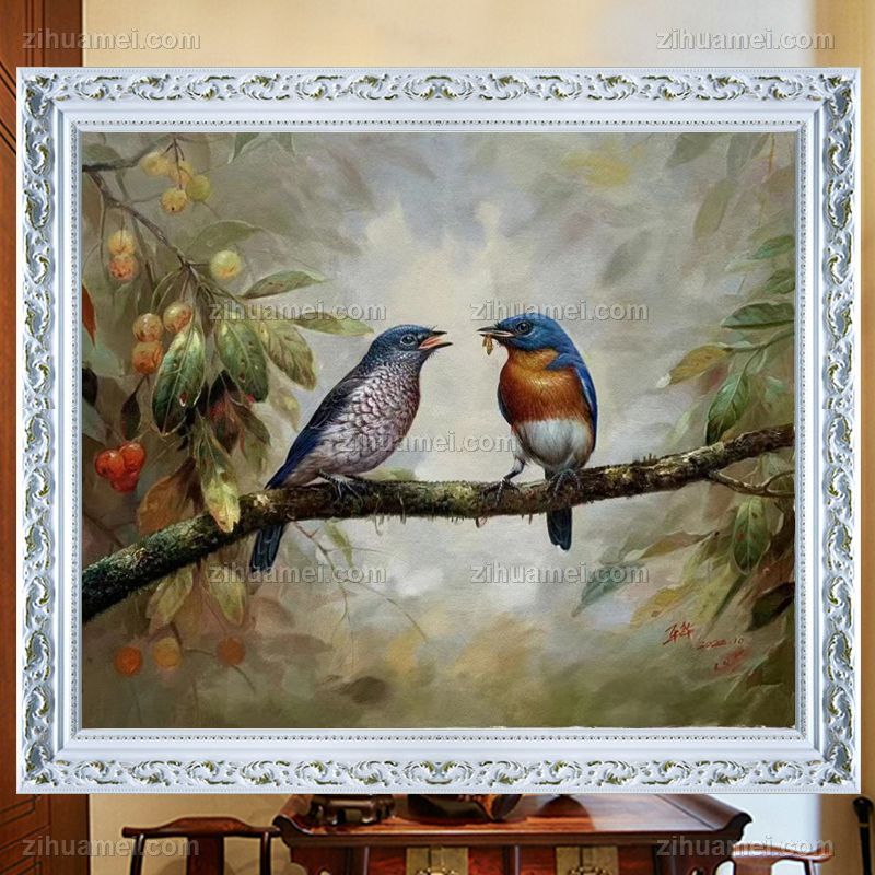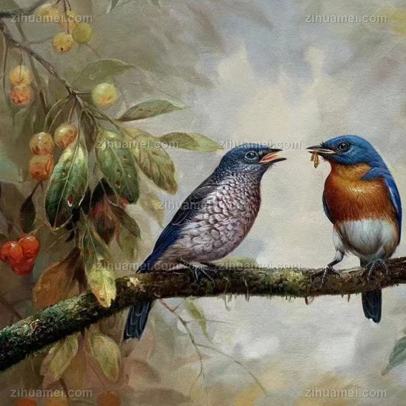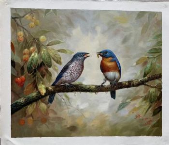 • 精品纯手绘动物写意油画荔枝树上的两只恩爱小鸟厚肌理油画