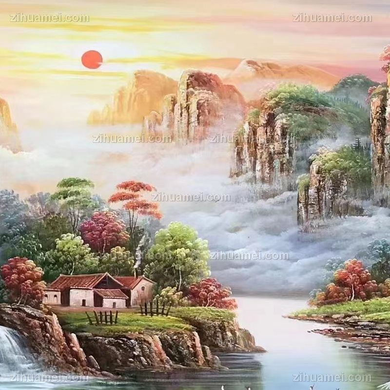 安居乐业山川风景油画纯手绘风景聚宝盆油画 手绘