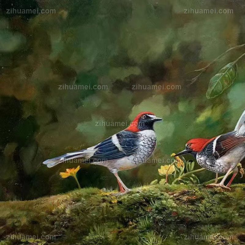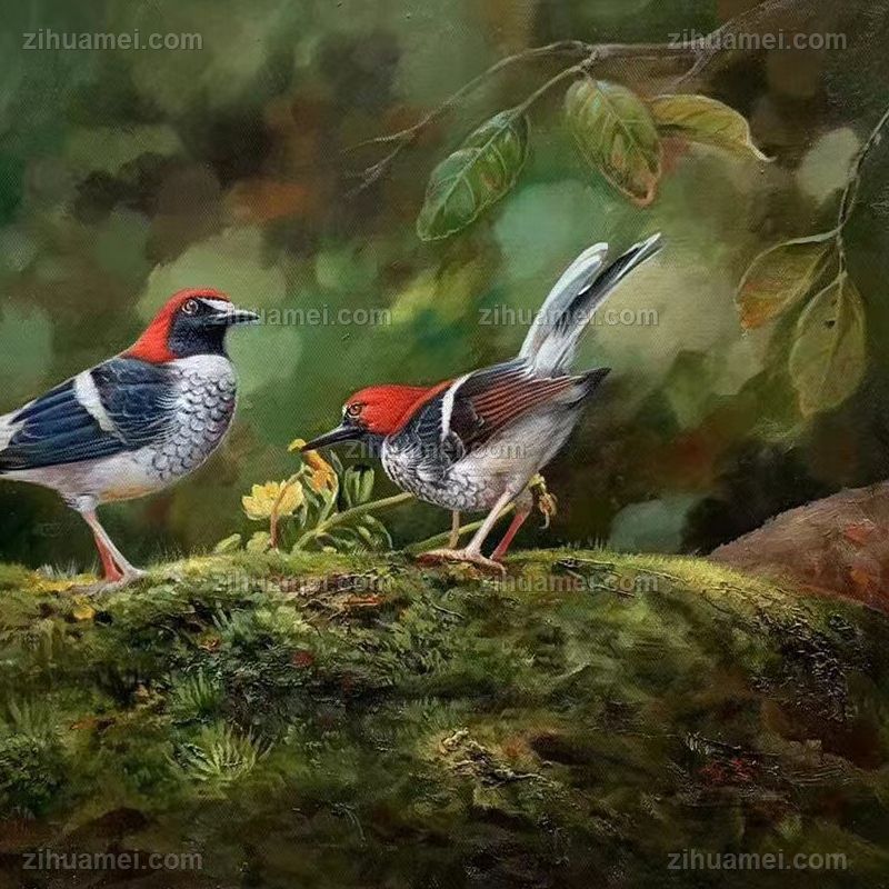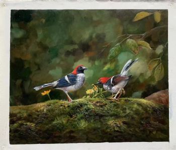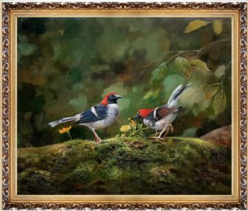 • 丛林中的两只美丽小鸟纯手绘油画动物写实油画实木画框