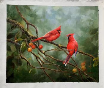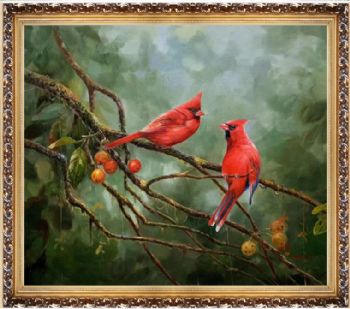 • 新中式动物写实油画树枝上的红色两只小鸟图实木画框