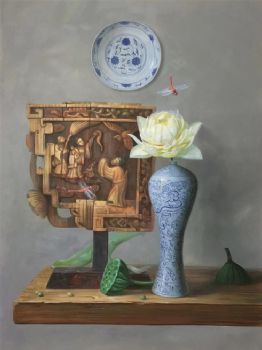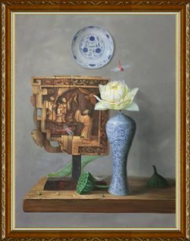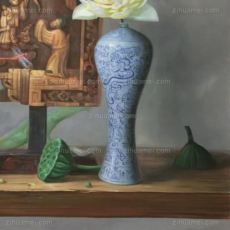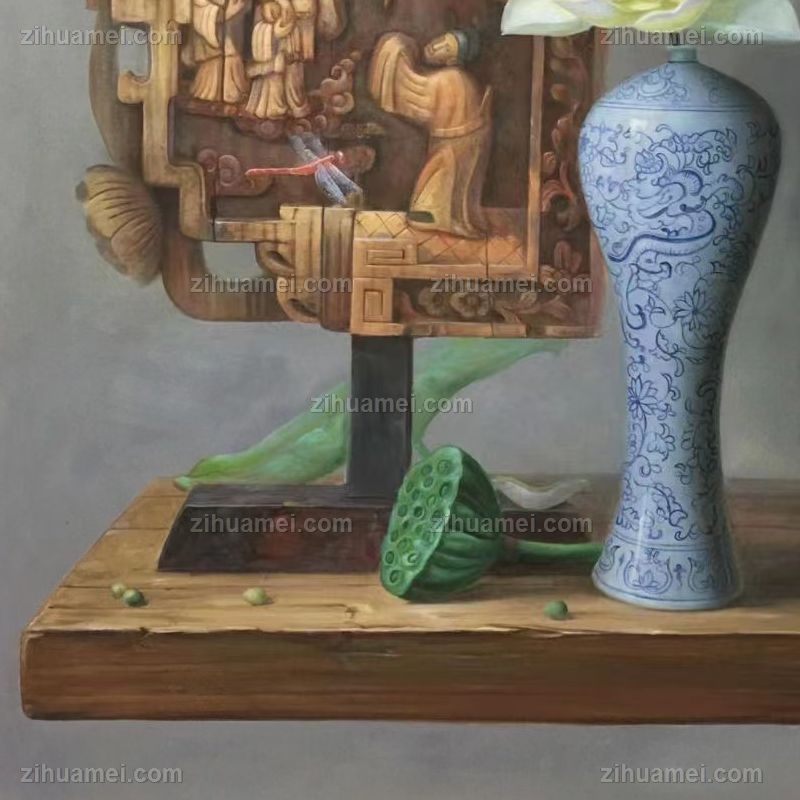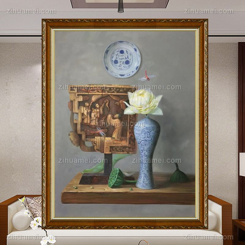 • 寓意平安幸福静物超写实油画新中式青花瓷写实油画纯手绘油画