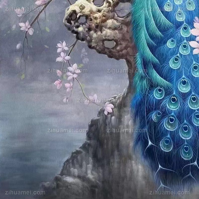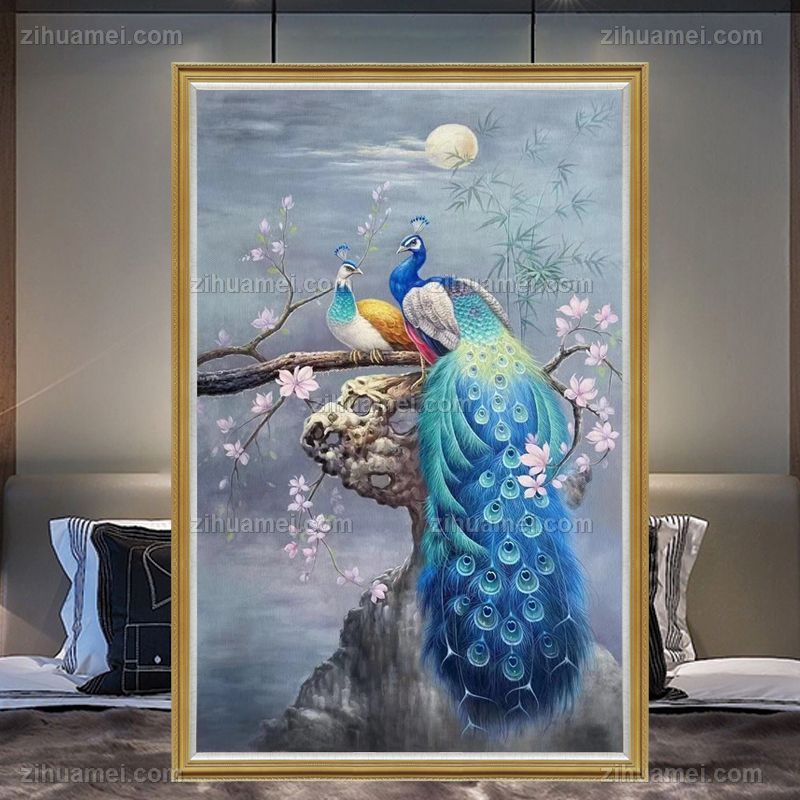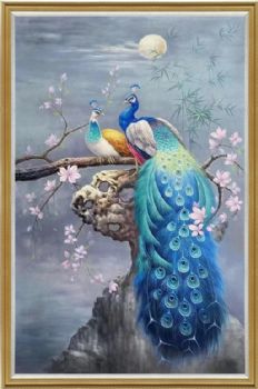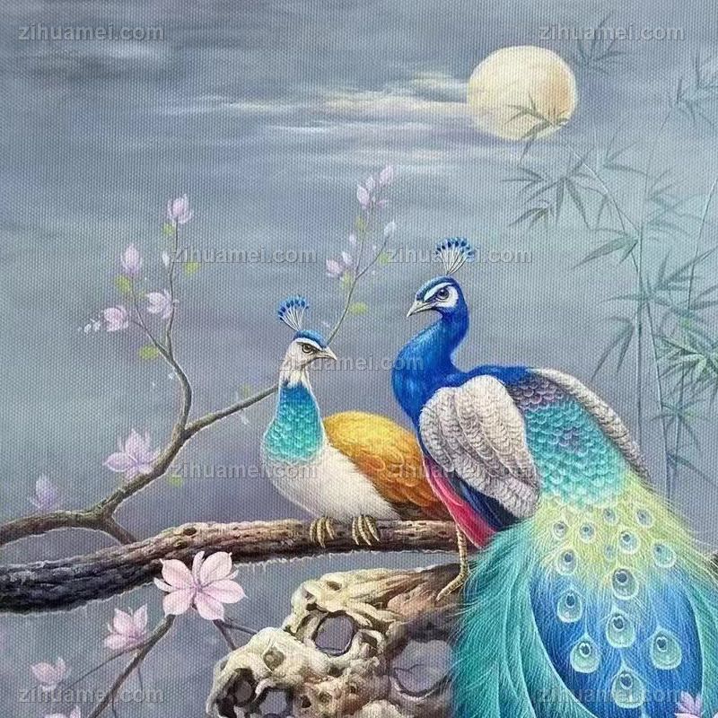 • 月光下的双孔雀图新中式动物写实油画纯手绘油画