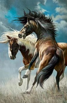• 写实动物油画纯手绘油画双雄图骏马油画实木画框