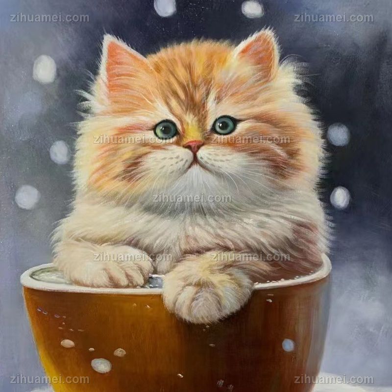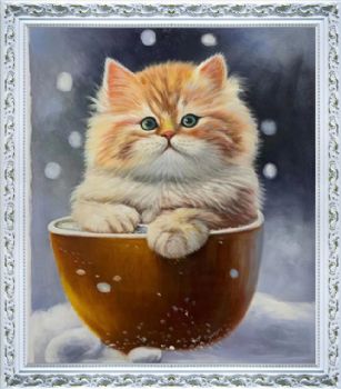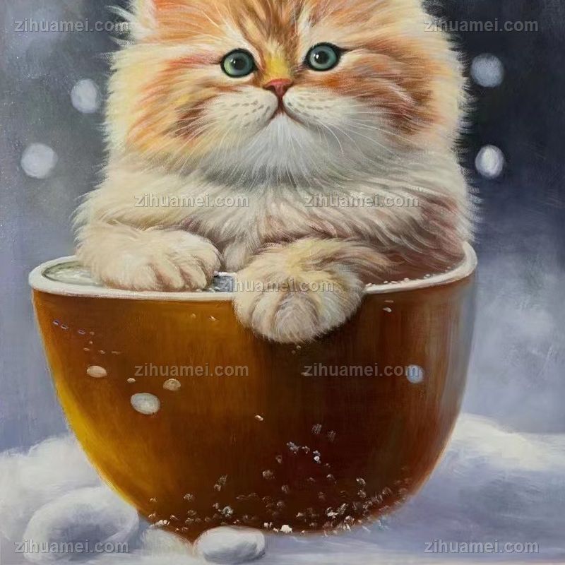 • 雪地里在篮子的小猫咪纯手绘油画动物写实油画