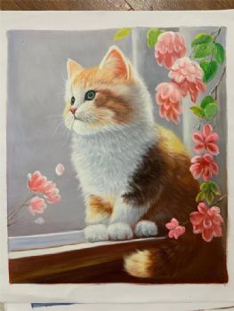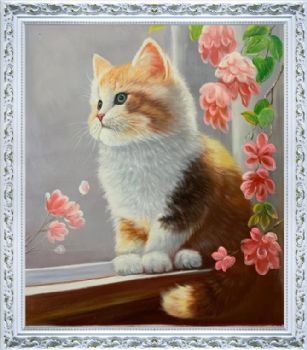 • 窗前的一只小猫纯手绘油画动物写实油画实木画框