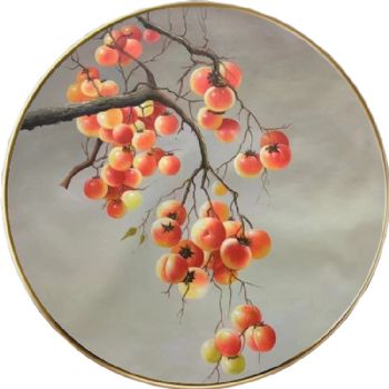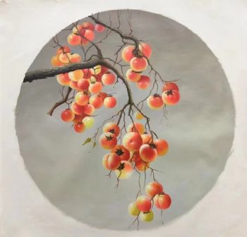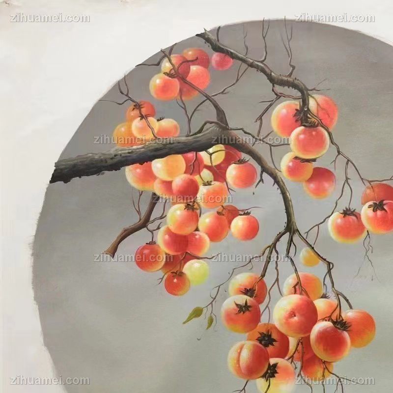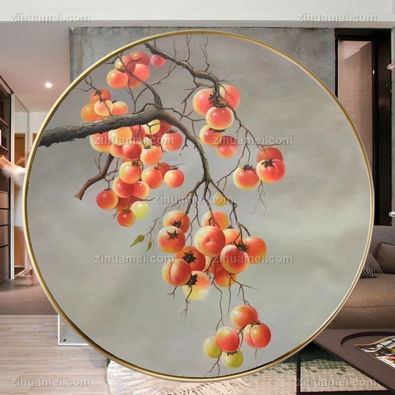 • 圆形写实油画纯手绘油画柿子图事事如意铝合金外框