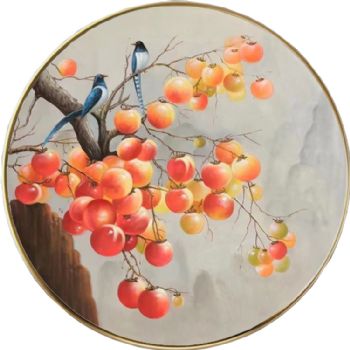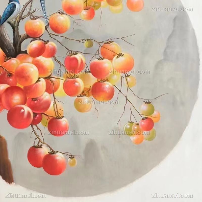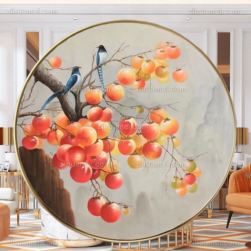 • 喜上枝头圆形写实油画纯手绘油画喜鹊柿子图事事如意铝合金外框