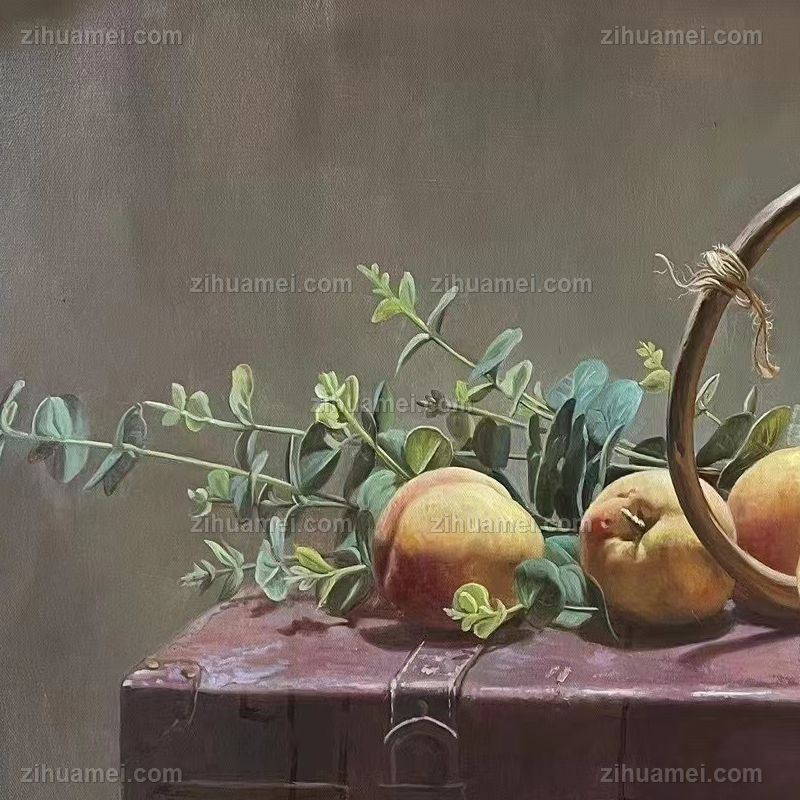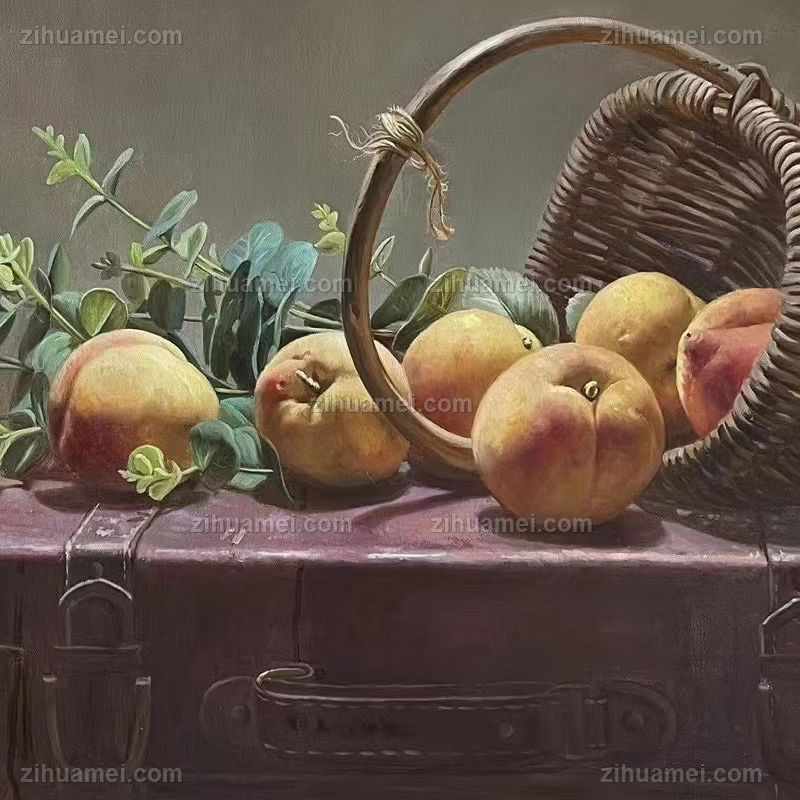 • 精品静物写实油画收藏油画皮箱上的桃子图实木画框