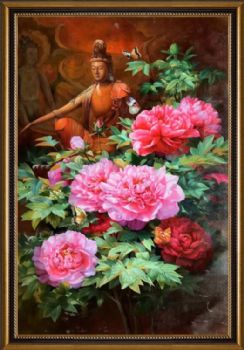 • 菩萨保佑花开富贵纯手绘牡丹花卉油画实木画框