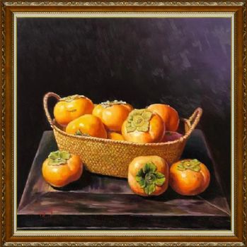好事一箩框新中式静物写实油画事事如意柿子图 手绘
