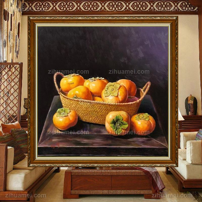 纯手绘柿子油画静物写实新中式客厅挂画 手绘
