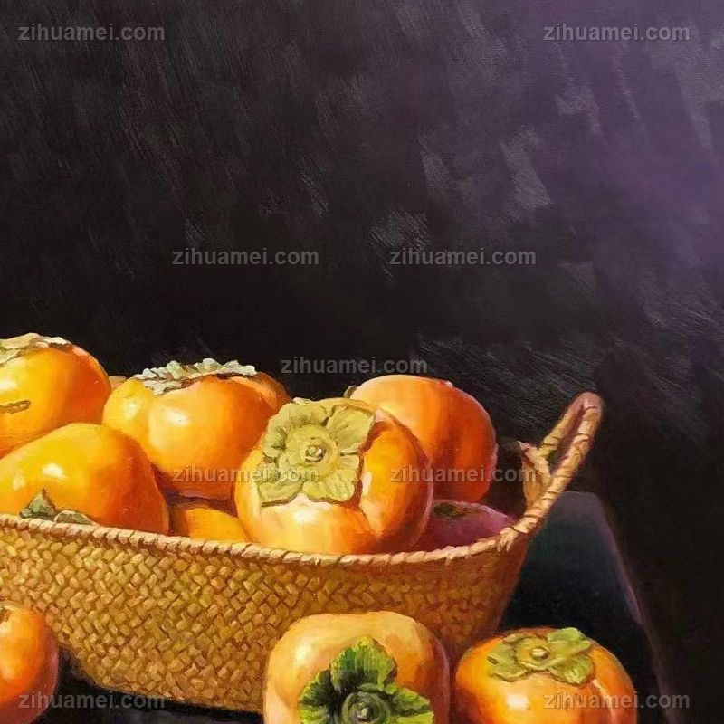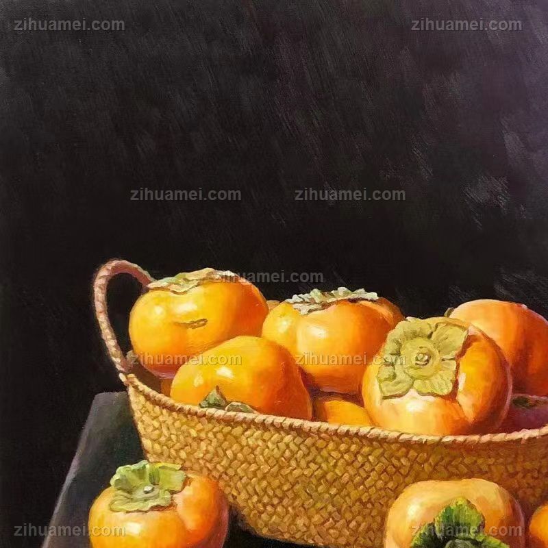 写实静物手绘油画好柿一箩框柿子图事事如意 手绘