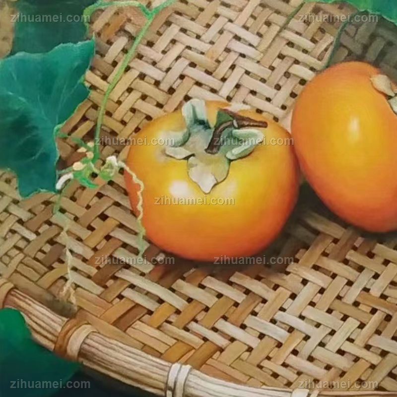 写实静物手绘油画好柿一箩框柿子图事事如意 手绘