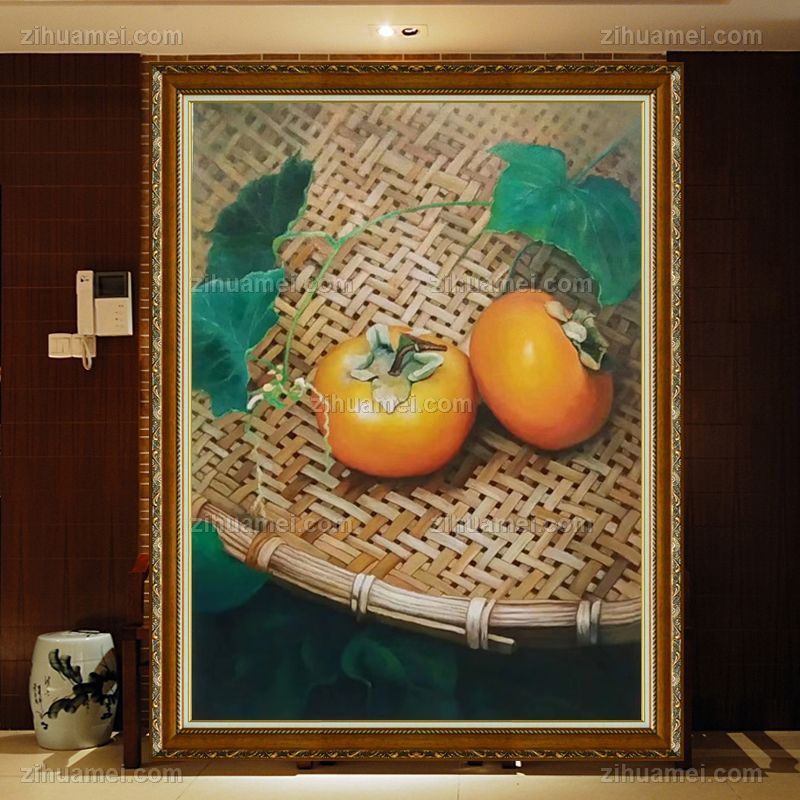 • 玄关油画好事成双新中式纯手绘静物写实油画柿子图精品油画