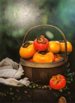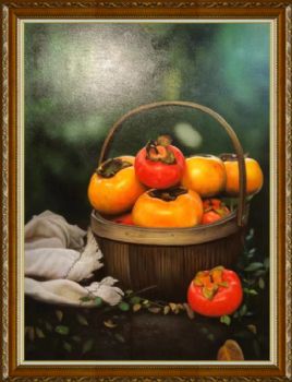 好事一箩框新中式静物写实油画事事如意柿子图 手绘