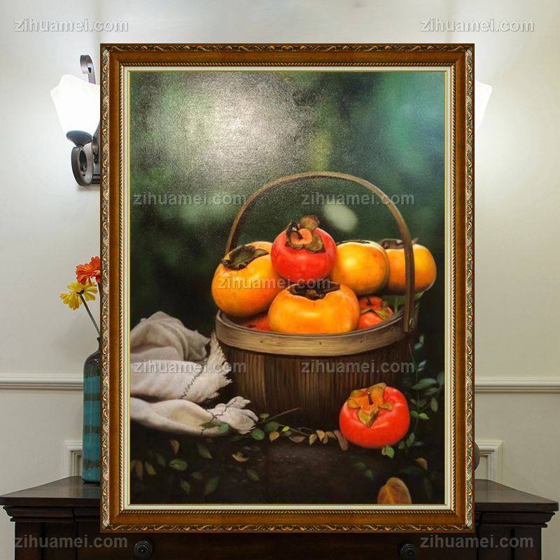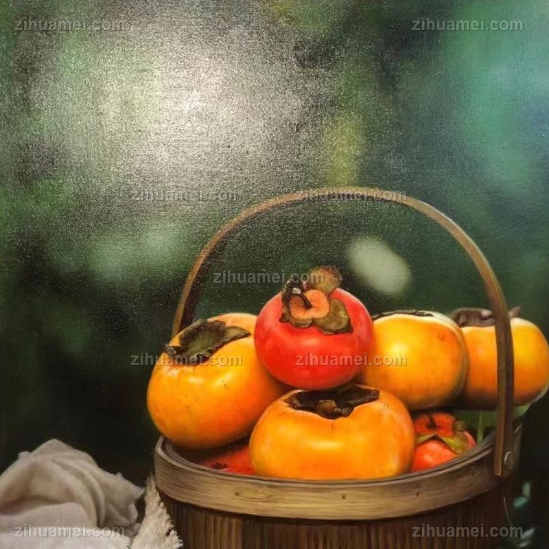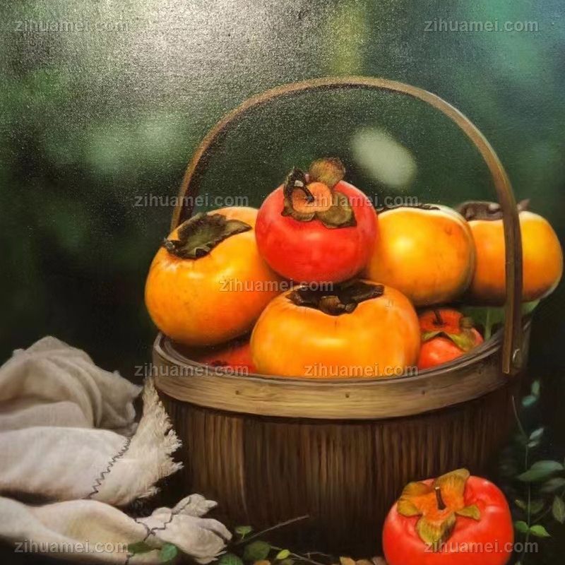 写实静物手绘油画好柿一箩框柿子图事事如意 手绘