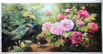• 适合新中式大厅客厅孔雀牡丹油画