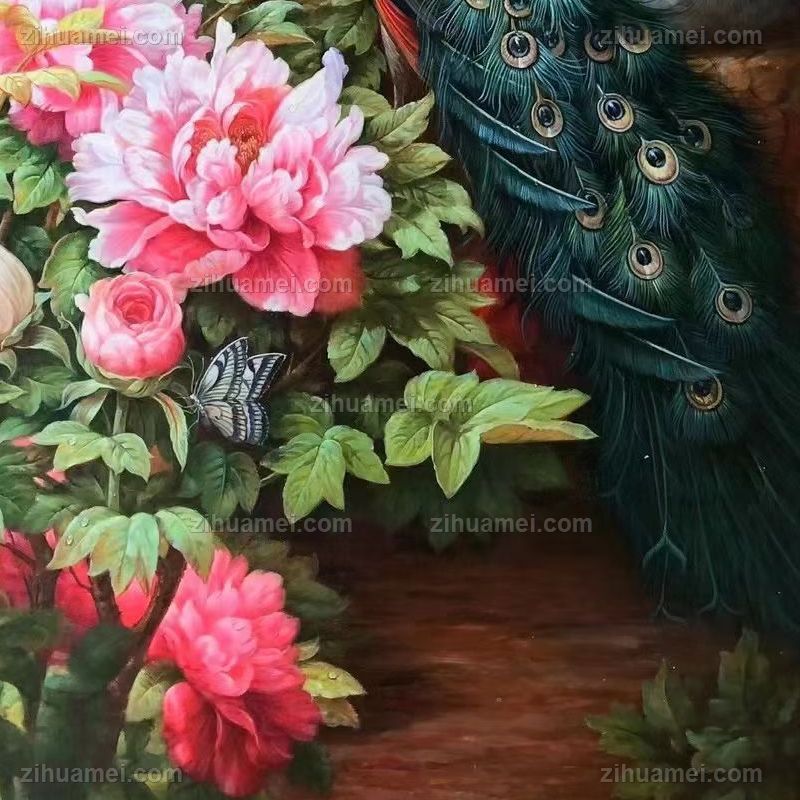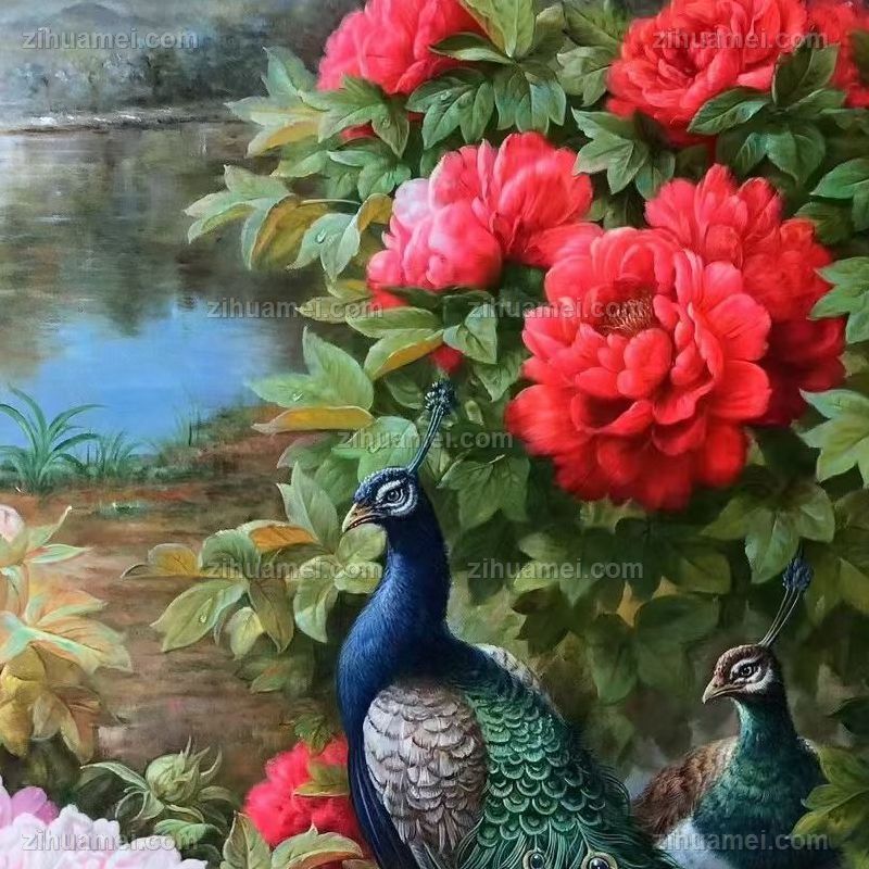 • 幸福吉祥花开富贵孔雀牡丹精品写实油画纯手绘新中式挂画实木画框