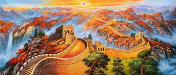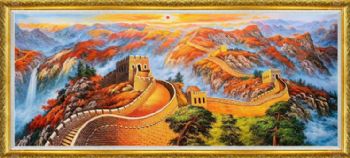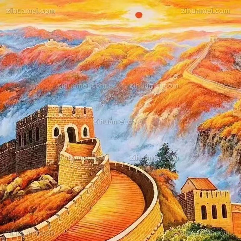 • 旭日东升江山永固万里长城风景油画纯手绘油画实木金色外框
