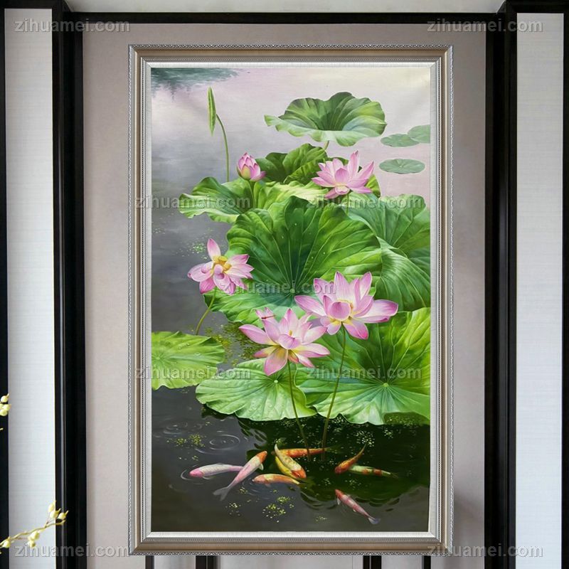 • 风景油画荷花池风景油画纯手绘油画年年有鱼实木画框