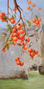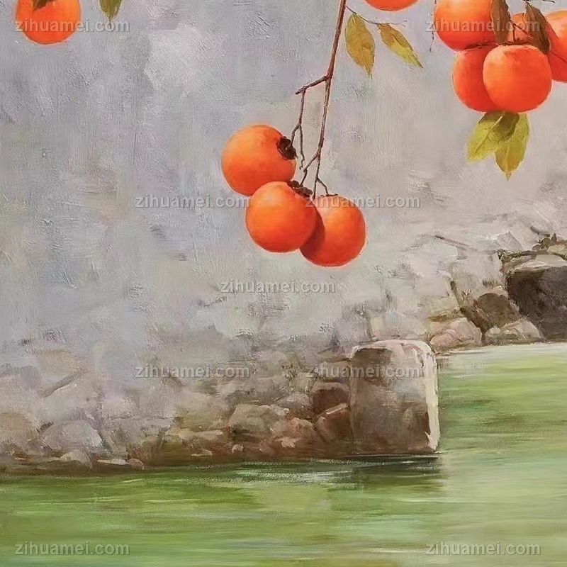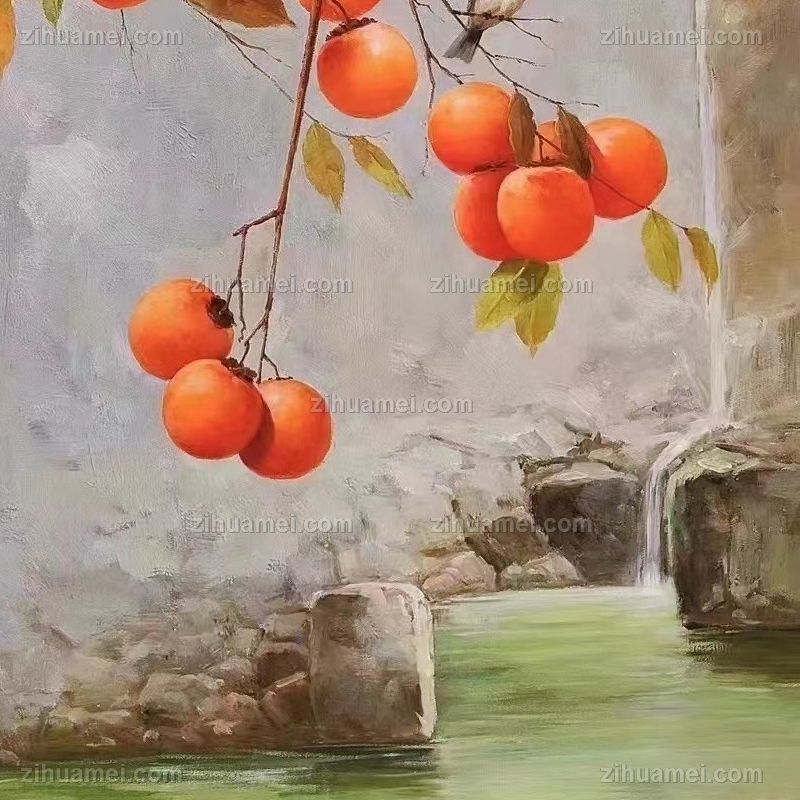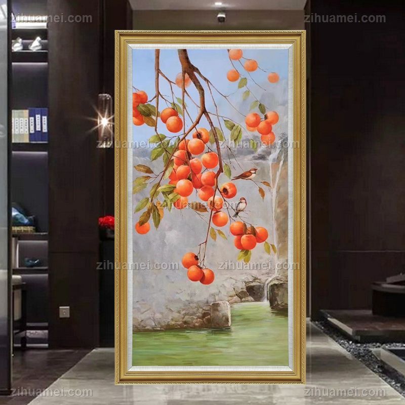 • 石来运转新中式纯手绘柿子图油画事事如意喜上枝头实木画框