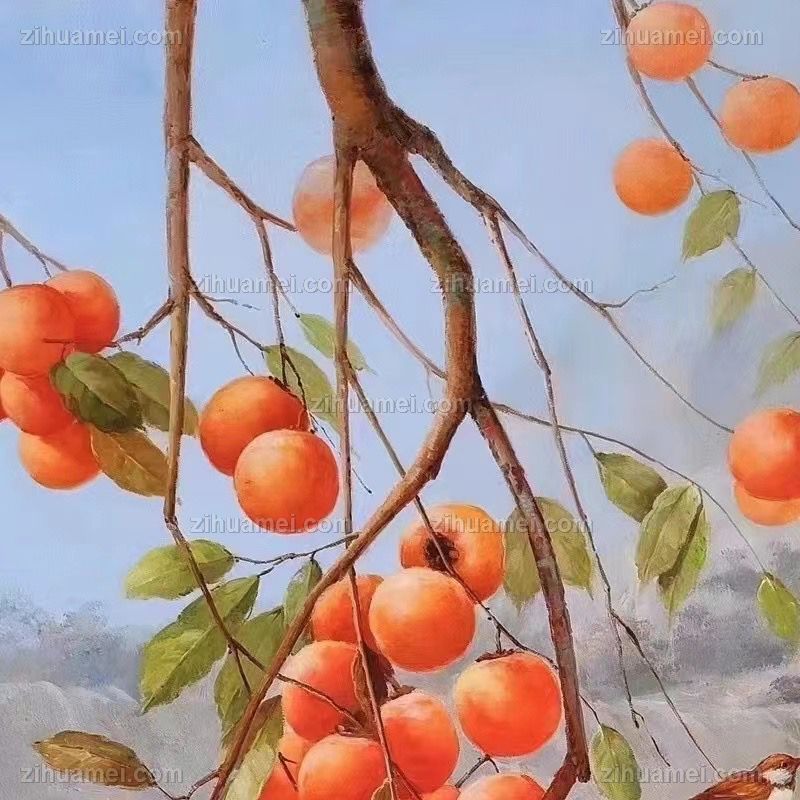 小写意纯手绘花鸟油画柿子图世世如意实木画框 手绘