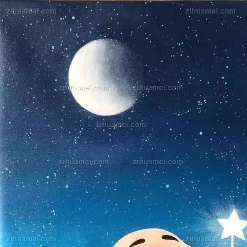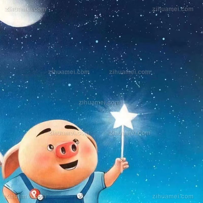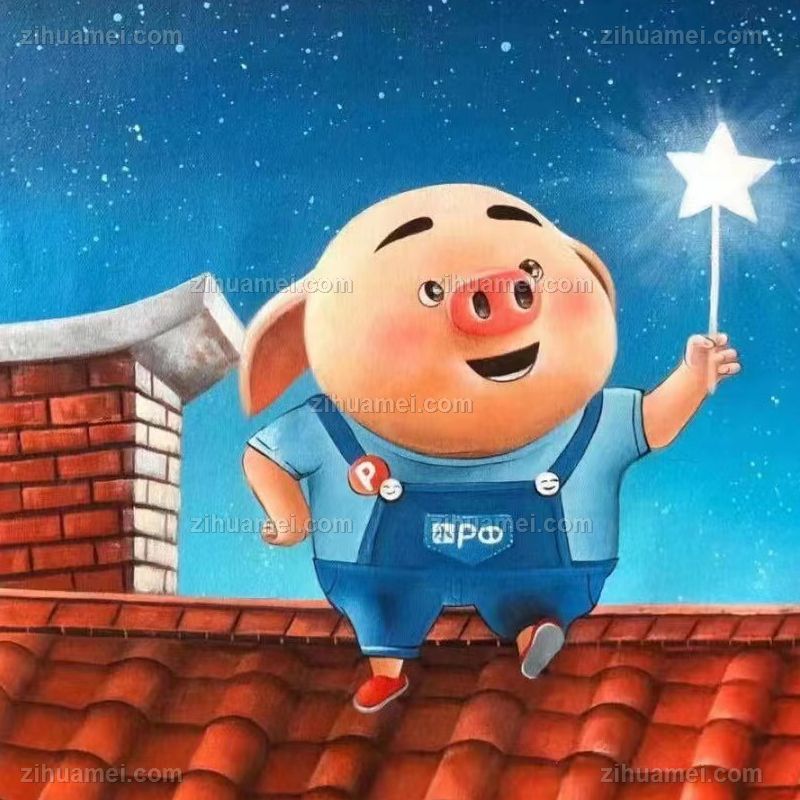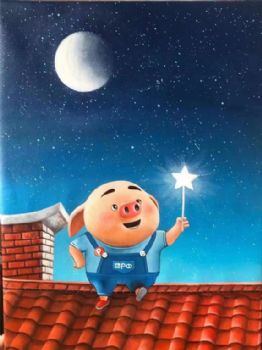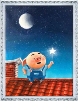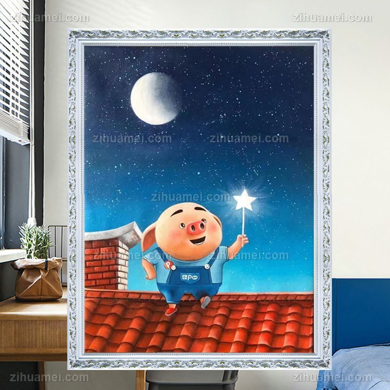 • 儿童卧室油画纯手绘人物油画动漫油画小星星下的猪猪图